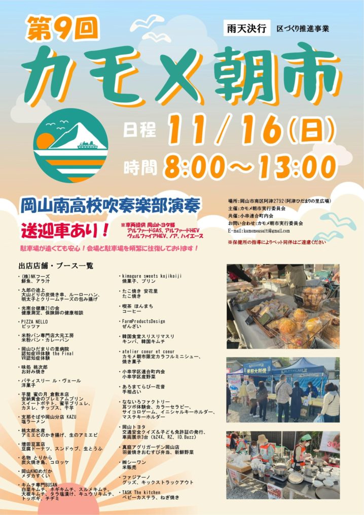 2025.11.15 岡山県内のイベント okayama-kodomo 2025.11.16【第9回 カモメ朝市】(岡山市南区) ポスト シェア はてブ 送る Pocket 【第9回 カモメ朝市】 日時:2025年11月16日(日)8:00~13:00 場所:阿津ひだまりの里広場(岡山市南区阿津2792) >>公式instagram シェア! ポスト シェア はてブ 送る Pocket feedly
