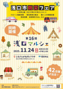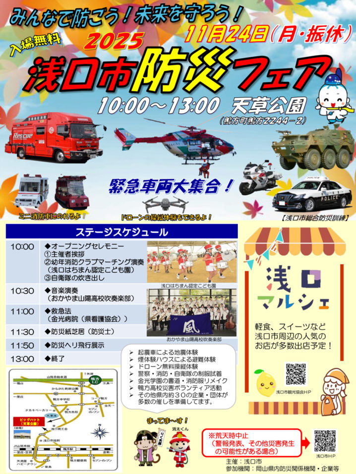 自衛隊の豚汁炊き出しや浅口マルシェの地元グルメなどお楽しみもたくさん。