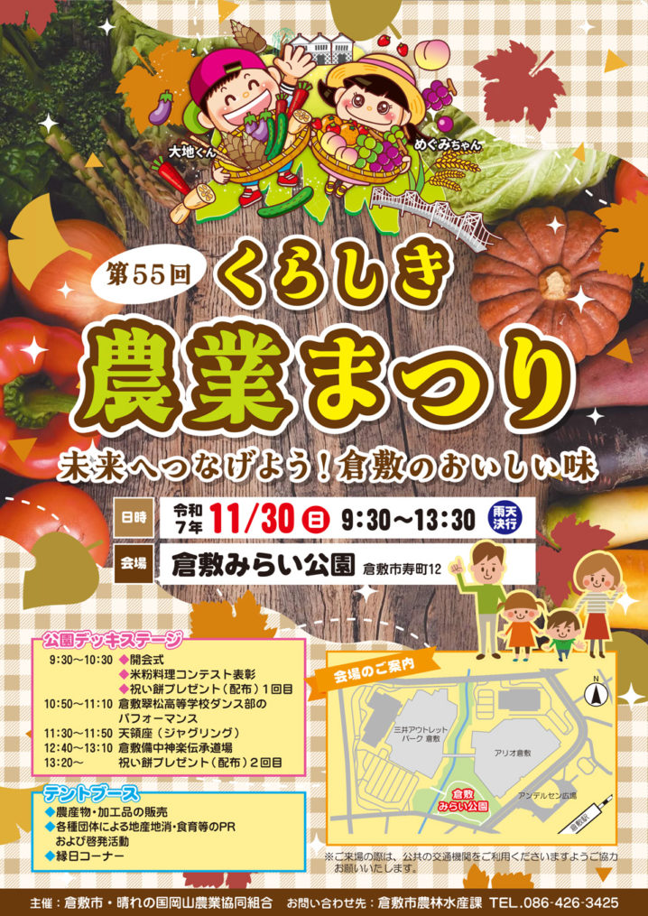 「未来へつなげよう!倉敷のおいしい味」をテーマに、食の安全・安心と地産地消を推進する農業のイベントを開催します。