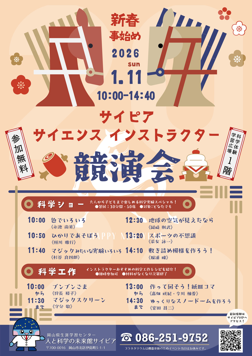 2026.01.02 岡山県内のイベント okayama-kodomo 2026.1.11【新春事始め サイエンスインストラクター競演会】(岡山市北区/人と科学の未来館サイピア) ポスト シェア はてブ 送る Pocket 【新春事始め サイエンスインストラクター競演会】 日時:2026年1月11日(日)10:00~14:40 場所:人と科学の未来館サイピア(岡山市北区伊島町3-1-1) >>公式情報はこちら シェア! ポスト シェア はてブ 送る Pocket feedly