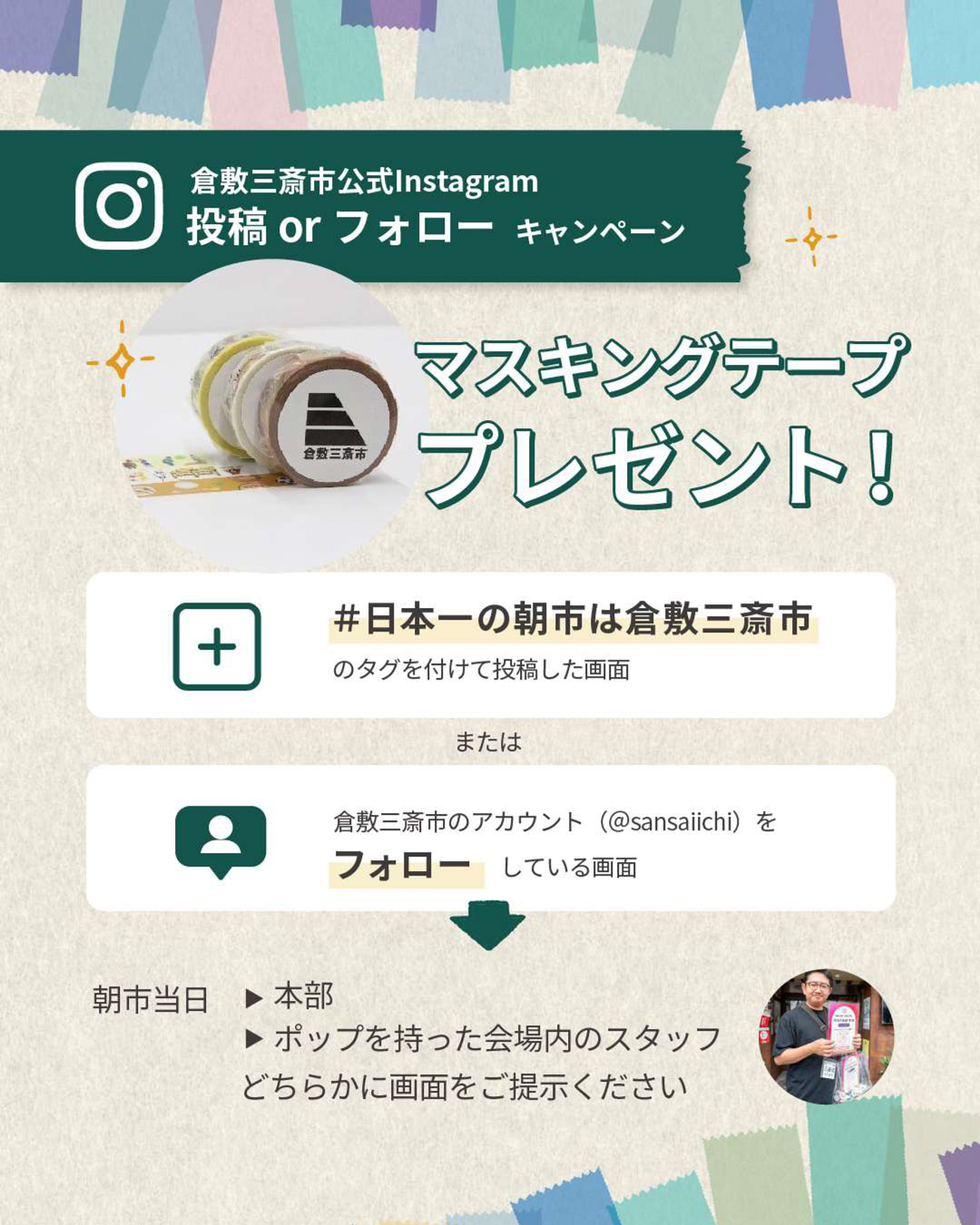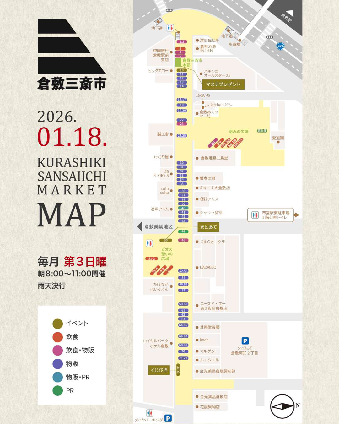 倉敷三斎市は、高梁川流域(倉敷市をはじめ、源流の岡山県北部新見市から瀬戸内の笠岡諸島まで10の市町)を中心とした「地産地消」をテーマに朝市を開催しています。今が旬の新鮮な野菜や果物、季節の花、工芸品、高級和牛に瀬戸内海の海の幸、地元の食材にこだわったお弁当やお惣菜、パン、焼き菓子、老舗の和菓子や調味料など、高梁川流域各地の特産品が、勢ぞろいしています。