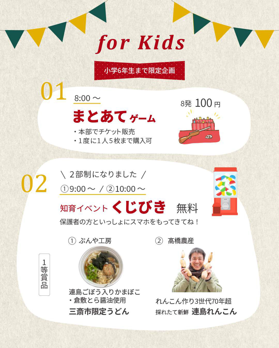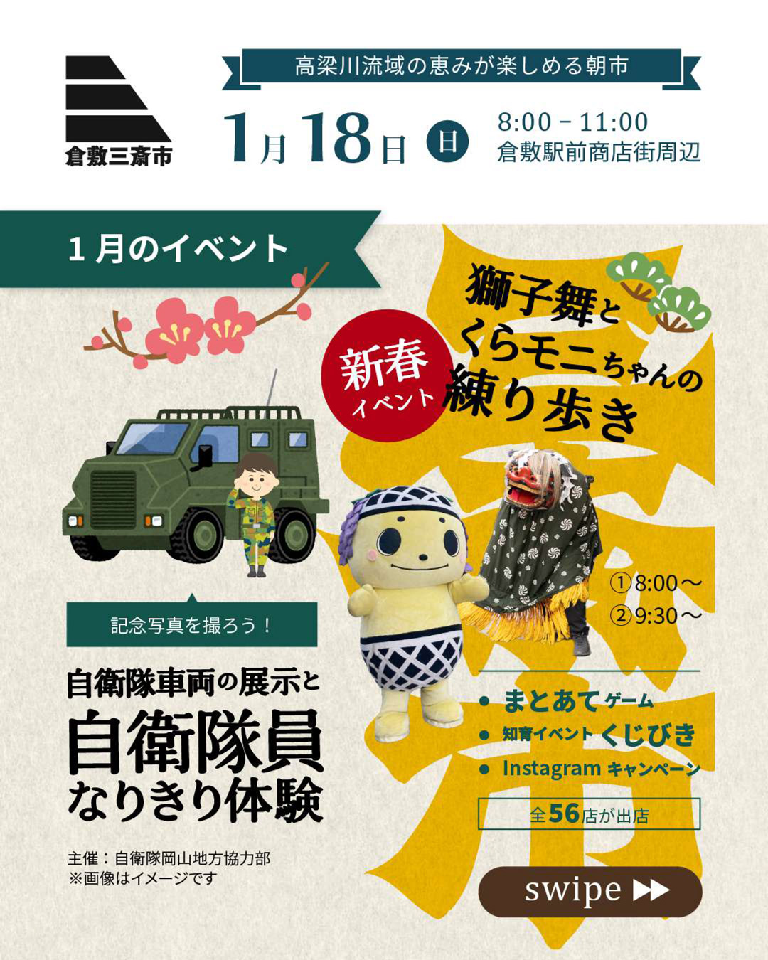 1月、会場内に獅子舞と倉敷三斎市のかわいいマスコットくらモニちゃんが登場予定!新春を祝って元気いっぱいに朝市を盛り上げます♪