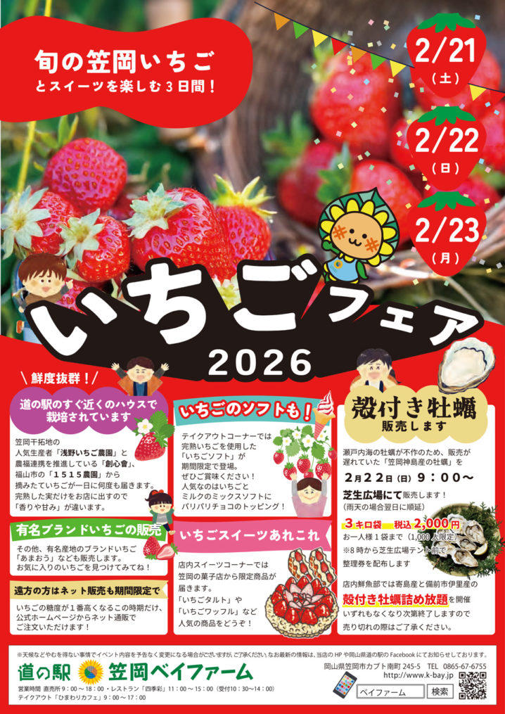 2026.02.13 岡山県内のイベント okayama-kodomo 2026.2.21-23【いちごフェア2026】(笠岡市/道の駅笠岡ベイファーム) ポスト シェア はてブ 送る Pocket 【いちごフェア2026】 日時:2026年2月21日(土)~23日(月祝) 場所:道の駅笠岡ベイファーム(笠岡市カブト南町245−5) >>公式情報はこちら シェア! ポスト シェア はてブ 送る Pocket feedly