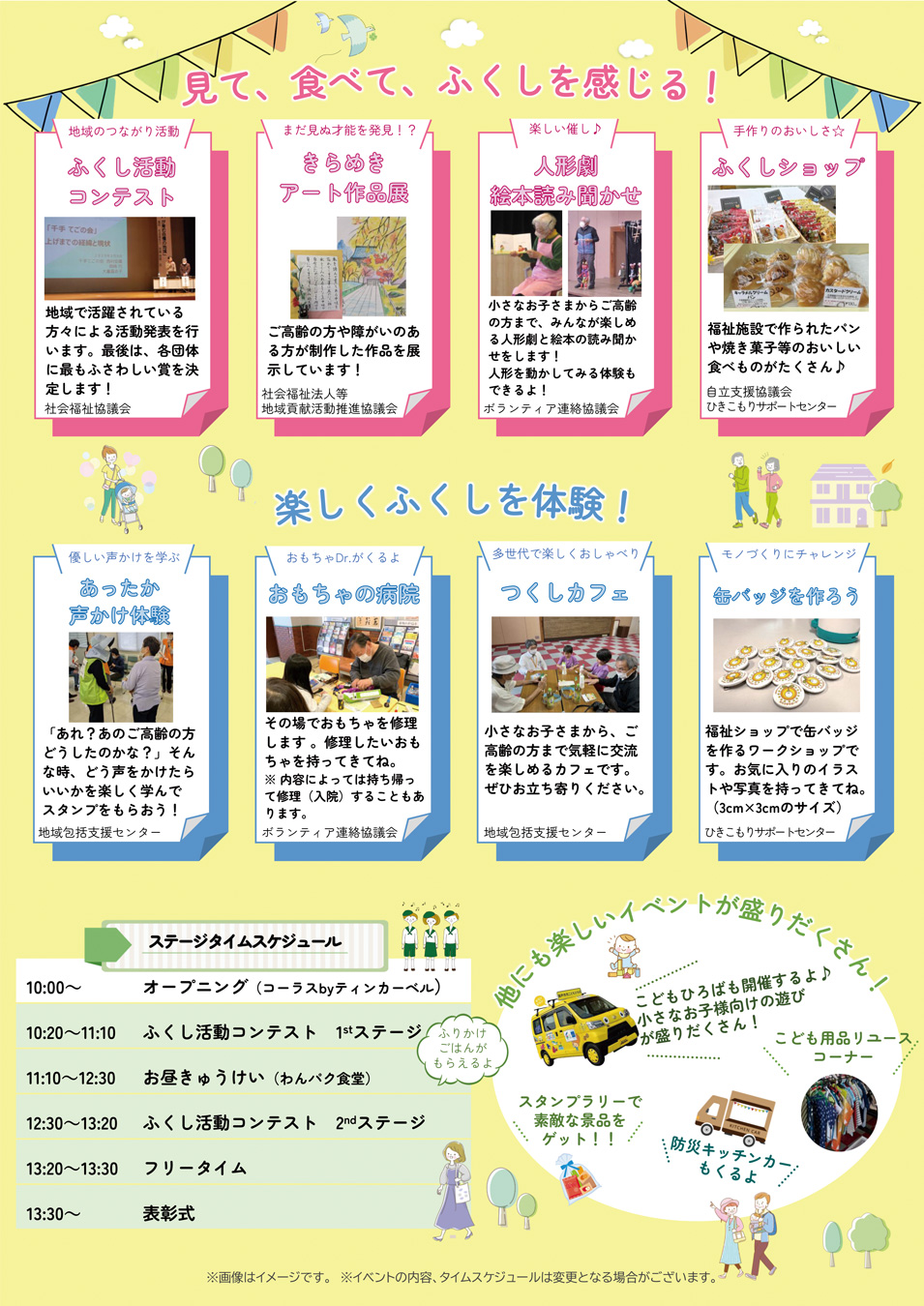 地域で「ふだんの くらしの しあわせ」のために活動をされている団体の発表が聞ける「福祉活動コンテスト」や、楽しくふくしを体験できるイベントが盛りだくさん!