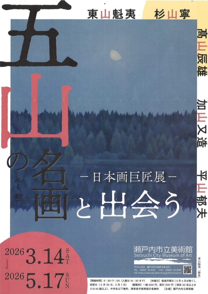 本展では、近代日本画の巨匠で五山と呼ばれた東山魁夷、杉山寧、高山辰雄、加山又造、平山郁夫による日本画を紹介します。五山はそれぞれ異なる時代背景やスタイルを持ちながらも、日本画の伝統を受け継ぎつつ現代的な視点で新しい芸術を創造し、日本画の新しい地平を切り開きました。日本画の持つ深い奥行と豊かな感性を感じとっていただければ幸いです。