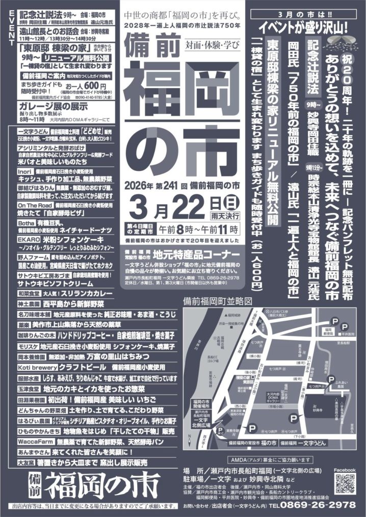 2026.03.15 岡山県内のイベント okayama-kodomo 2026.3.22【第241回備前福岡の市】(瀬戸内市) ポスト シェア はてブ 送る Pocket 【第241回備前福岡の市】 日時:2026年3月22日(日)8:00~11:00 場所:一文字うどん北側の広場(瀬戸内市長船町福岡) ※雨天決行 >>Facebookページ 毎月第4日曜日開催! シェア! ポスト シェア はてブ 送る Pocket feedly