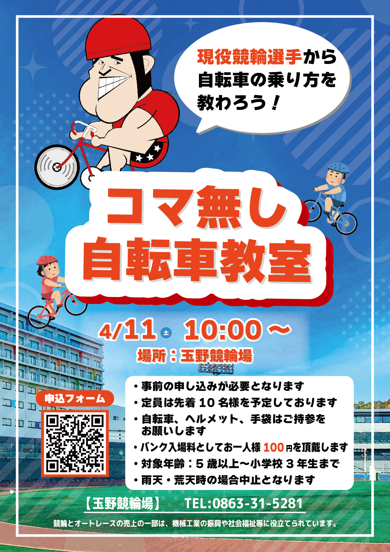 選手が疾走するバンク(走路)を特別開放し、子どもたちが自転車で走れる唯一無二の体験をはじめ、コマなし自転車教室・ミニレース実況・ステージショー・キッチンカーエリアまで、競輪場まるごと一日お祭り広場へと変貌します。