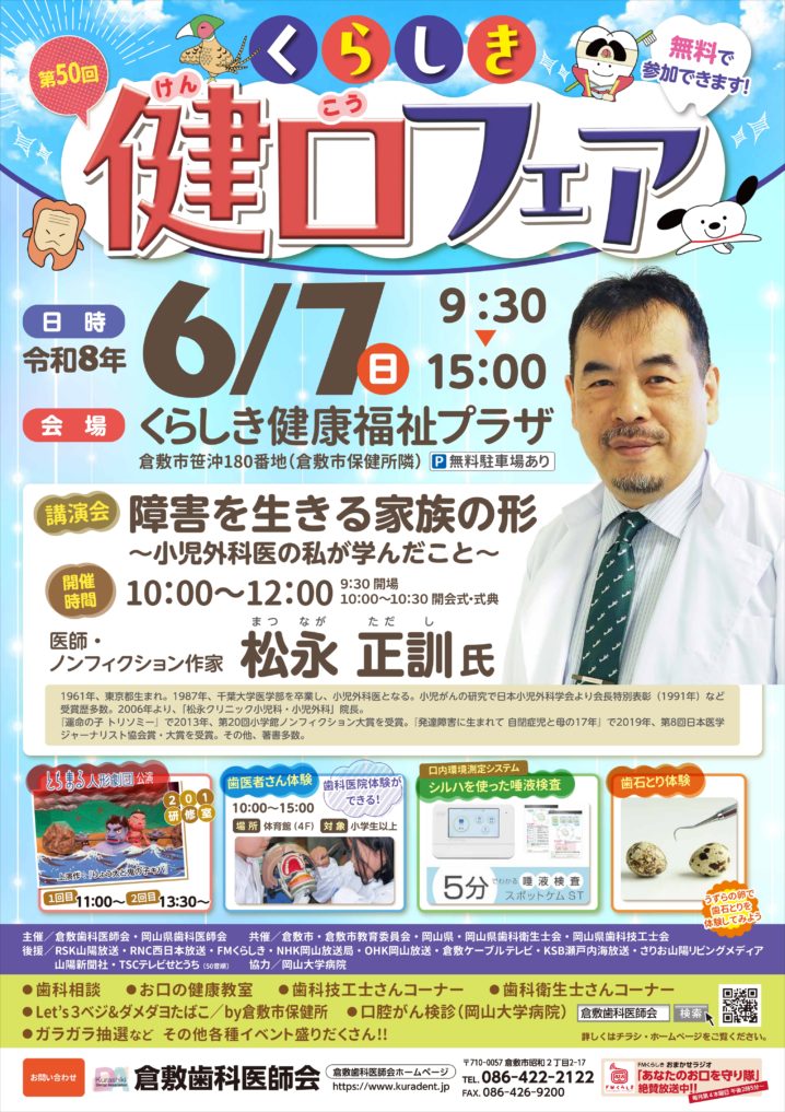 主催/倉敷歯科医師会・岡山県歯科医師会 共催/倉敷市・倉敷市教育委員会・岡山県・岡山県歯科衛生士会・岡山県歯科技工士会 後援/RSK山陽放送・RNC西日本放送・FMくらしき・NHK岡山放送局・OHK岡山放送・倉敷ケーブルテレビ・KSB瀬戸内海放送・さりお山陽リビングメディア・山陽新聞社・TSC