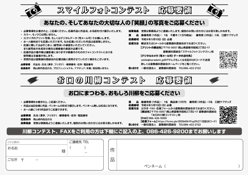※スマイルフォトコンテスト及びお口の川柳コンテストの応募条件として、岡山県在住の方が対象です。