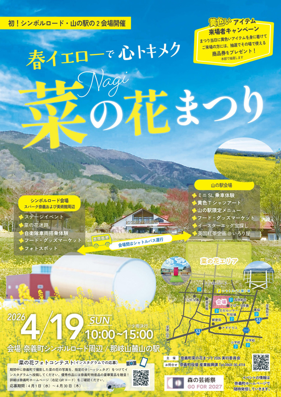 奈義町シンボルロード周辺と那岐山麓山の駅にて初めての2会場同時開催で実施いたします。春の彩り豊かな菜の花が咲き誇る風景を楽しみながら、各会場での魅力的な催しをご堪能ください。