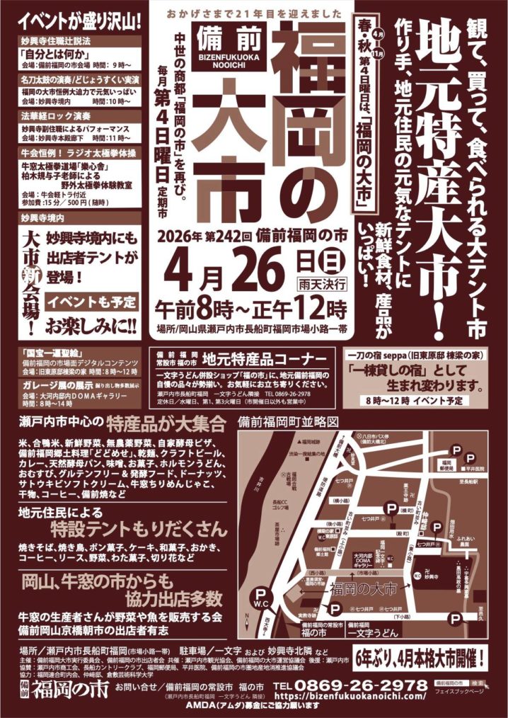 2026.04.13 岡山県内のイベント okayama-kodomo 2026.4.26【第242回備前福岡の市】(瀬戸内市) ポスト シェア はてブ 送る Pocket 【第242回備前福岡の市】 日時:2026年4月26日(日)8:00~12:00 場所:一文字うどん北側の広場(瀬戸内市長船町福岡) ※雨天決行 >>Facebookページ 毎月第4日曜日開催! シェア! ポスト シェア はてブ 送る Pocket feedly