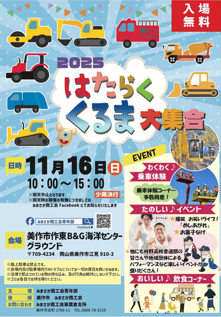 2025年11月16日(日)、美作市作東B&G海洋センター グラウンドにて「はたらくくるま大集合2025」開催!