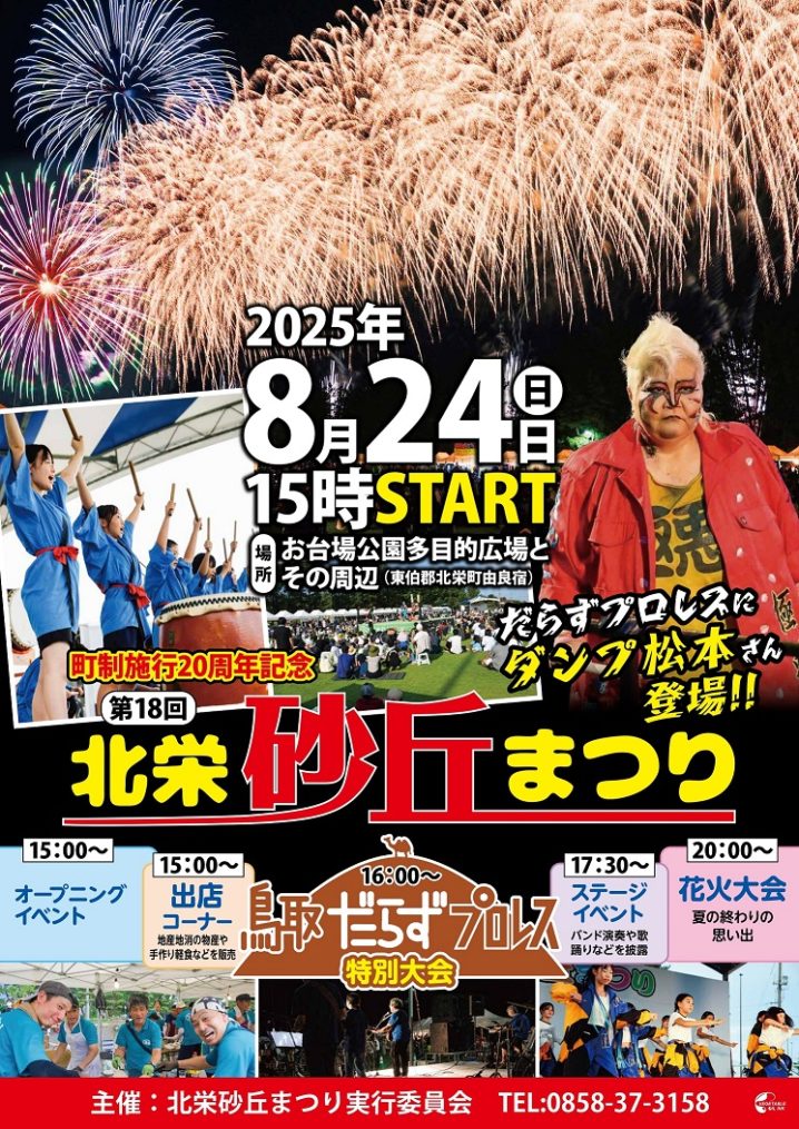屋台、ステージ、鳥取だらずプロレス特別公演など楽しいイベント盛りだくさん!そして、最後は打ち上げ花火が、夏の夜空を彩ります!