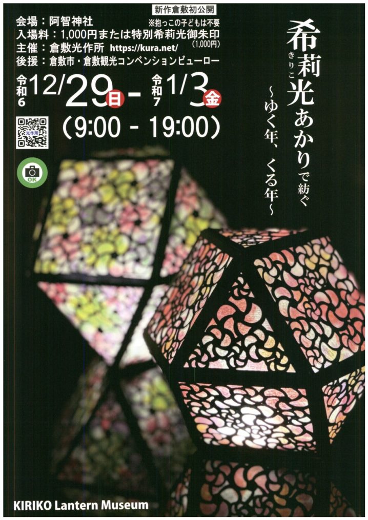 2024年夏に「ホテル雅叙園東京」で開催された、「和のあかり×百段階段2024~妖美なおとぎばなし~」に展示された新作と干支をモチーフにした作品が、倉敷の「阿智神社」で展示されます。