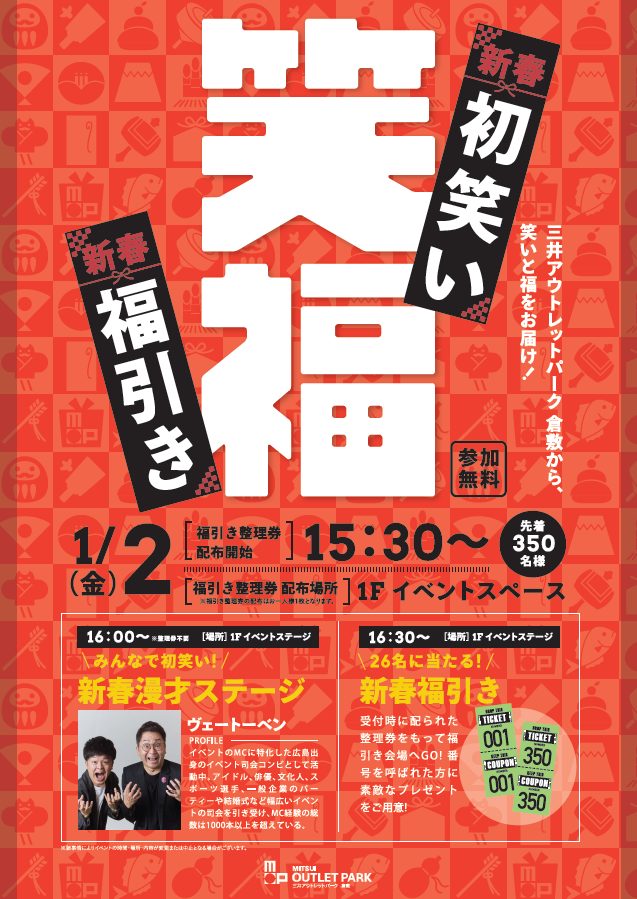 2026年1月2日(金)、三井アウトレットパーク倉敷にて「漫才ステージ・福引き」開催
