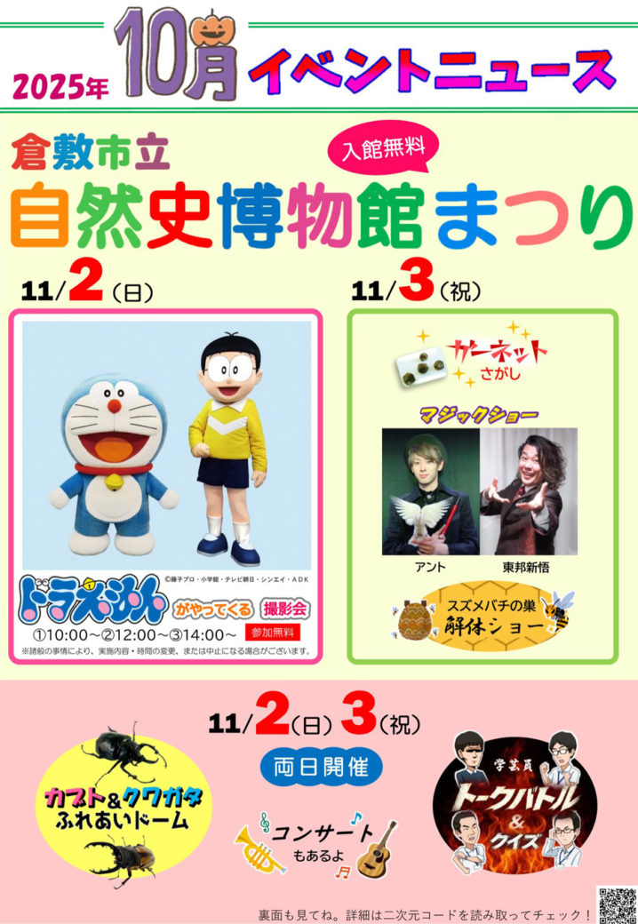 2025年11月2日(日)、3日(月祝)、倉敷市立自然史博物館にて「第25回自然史博物館まつり」開催!この日はなんと、どなたでも入場無料!