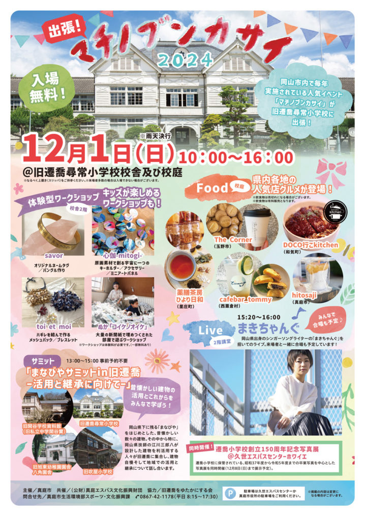 岡山市内で毎年実施されている人気イベント『マチノブンカサイ』を旧遷喬尋常小学校校舎と校庭を会場に出張して開催します。