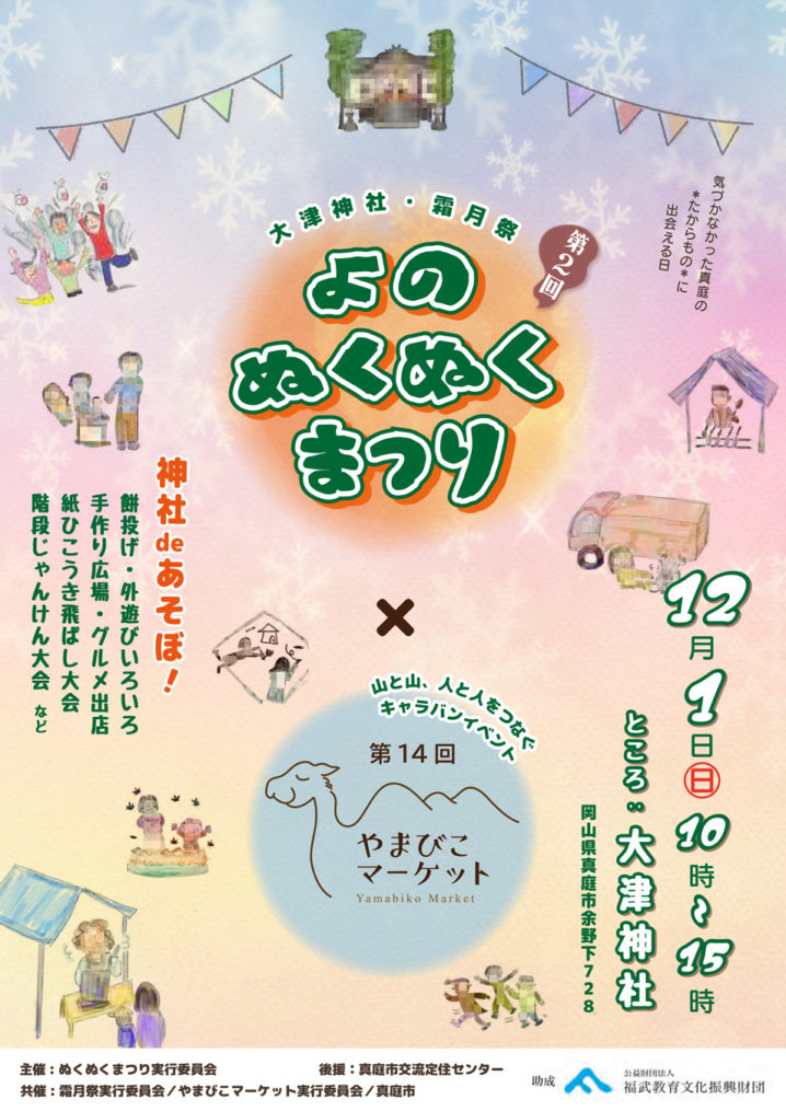 余野地区の伝統行事「霜月祭」に合わせて開催される「よの ぬくぬくまつり」と、真庭市内の各地域をキャラバンする「やまびこマーケット」のコラボイベント